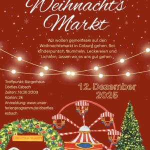 Wir wollen gemeinsam die Weihnachtszeit genießen. Gemeinsam gehen wir auf den Weihnachtsmarkt in Coburg und lassen es und bei Kinderpunsch, Bummeln, Leckereien und Lichtern gut gehen.