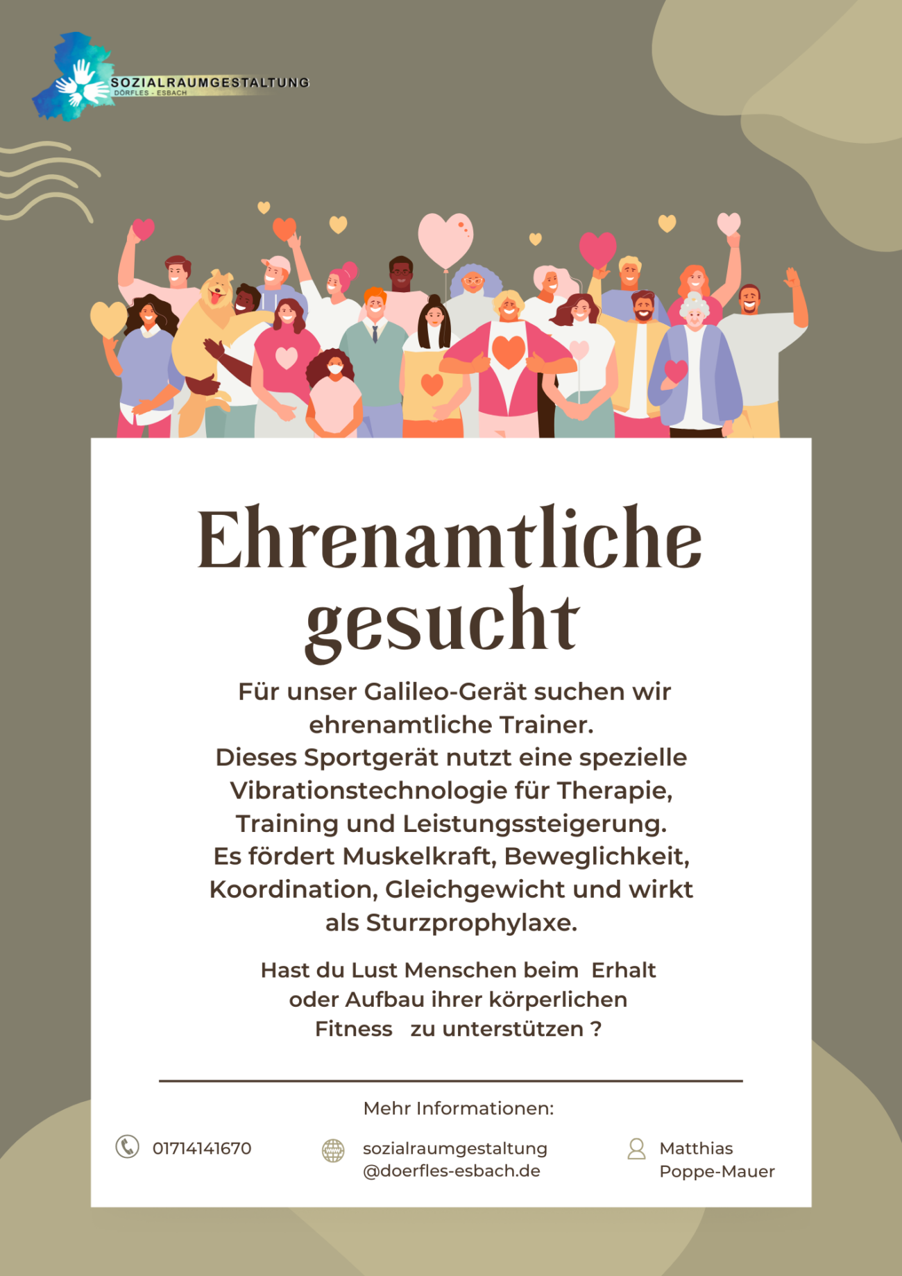Für unser Galileo-Gerät suchen wir ehrenamtliche Trainer. Dieses Sportgerät nutzt eine spezielle Vibrationstechnologie für Therapie, Training und Leistungssteigerung. Es fördert Muskelkraft, Beweglichkeit, Koordination, Gleichgewicht und wirkt als Sturzprophylaxe. Hast du Lust Menschen beim Erhalt oder Aufbau ihrer körperlichen Fitness zu unterstützen ? Unsere Kontaktdaten findest du unten auf dem Flyer.