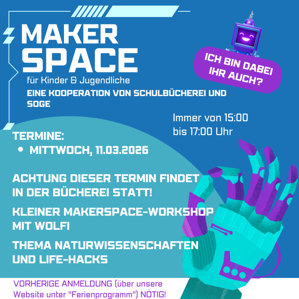 Auch 2026 bieten wir euch wieder die eine oder andere Maker-Space Einheit zum Ausprobieren, Machen und Staunen an. So habt ihr am 11. März von 15.00 – 17.00 Uhr die Möglichkeit an einem kleinen Maker-Space Workshop mit unserem Wolfi in der Schul-Bücherei teilzunehmen. Zusammen werdet ihr euch mit naturwissenschaftlichen Themen auseinandersetzen und wertvolle Life-Hacks kennenlernen. Sei dabei und erforsche zusammen mit Wolfi die Dinge um dich herum. Das wird ne spannende Nummer!